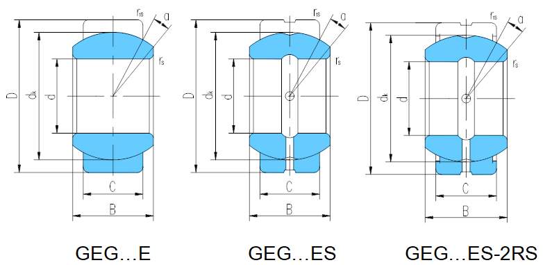 產品特點:外圈有一道軸向縫,內、外圈材料均為軸承鋼,淬火,磷化,滑動表面涂敷二硫化鉬。除型號后置代號為E外,其余型號內、外圈均有潤滑油槽油孔,后置代號有-2RS為外圈兩端帶有密封圈。