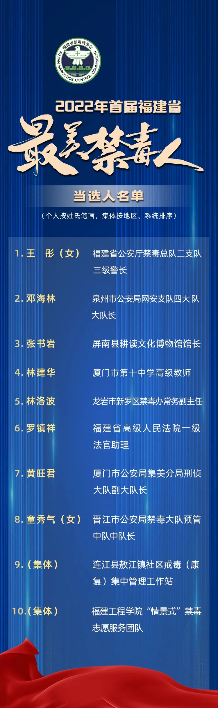 按照《關(guān)于組織開展全省首屆“最美禁毒人”宣傳推選活動(dòng)的通知》要求,經(jīng)基層推薦、組織初審、網(wǎng)絡(luò)投票、專家評(píng)審等程序,中共福建省委宣傳部、福建省禁毒委員會(huì)辦公室確定了2022年首屆福建省“最美禁毒人”10名當(dāng)選人、10名提名獎(jiǎng)獲得者最終獲評(píng)名單。現(xiàn)將名單予以公示,接受監(jiān)督。如有異議,請(qǐng)?jiān)诠酒谙迌?nèi),通過來信、來電等方式,實(shí)名反映情況。