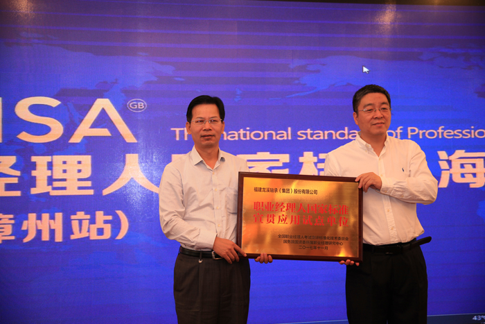 ????2017年11月10日,由國(guó)務(wù)院國(guó)資委所屬職業(yè)經(jīng)理研究中心指導(dǎo),漳州市委組織部、漳州市國(guó)資委主辦,公司協(xié)辦的“職業(yè)經(jīng)理人國(guó)家標(biāo)準(zhǔn)”海西行首站在漳州舉行。國(guó)務(wù)院國(guó)資委所屬職業(yè)經(jīng)理研究中心主任助理、全國(guó)職業(yè)經(jīng)理人考試測(cè)評(píng)標(biāo)準(zhǔn)化技術(shù)委員會(huì)副秘長(zhǎng)王新偉做了以《職業(yè)經(jīng)理人國(guó)家標(biāo)準(zhǔn)應(yīng)用及職業(yè)經(jīng)理人培養(yǎng)和隊(duì)伍建設(shè)》為主題的演講。隨后舉行了授牌儀式,王新偉代表國(guó)務(wù)院國(guó)資委所屬職業(yè)經(jīng)理研究中心為公司“職業(yè)經(jīng)理人國(guó)家標(biāo)準(zhǔn)宣貫應(yīng)用試點(diǎn)單位”授牌。