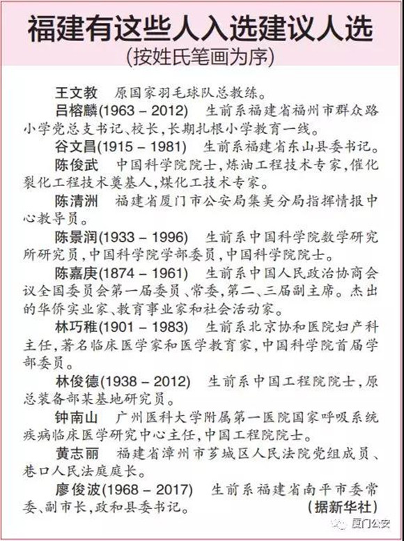 ????在前期的遴選推薦、群眾網(wǎng)上投票、組委會(huì)集中審議、中央和國(guó)家機(jī)關(guān)有關(guān)部門認(rèn)真審核下,組委會(huì)于9月15日公示了300名“最美奮斗者”建議人選名單。其中,“時(shí)代楷模”、全國(guó)公安系統(tǒng)一級(jí)英模、廈門市公安局民警陳清洲和漳州市薌城區(qū)人民法院黨組成員、巷口人民法庭庭長(zhǎng)黃志麗榜上有名。同時(shí),福建共有12人入選建議人選名單。
