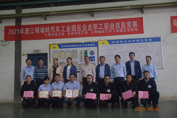 ▲三明市總工會(huì)、永安市總工會(huì)、三明埔?guī)X汽車(chē)工業(yè)園區(qū)管委會(huì)領(lǐng)導(dǎo)及龍軸集團(tuán)永軸公司領(lǐng)導(dǎo)班子與獲獎(jiǎng)選手合影留念
