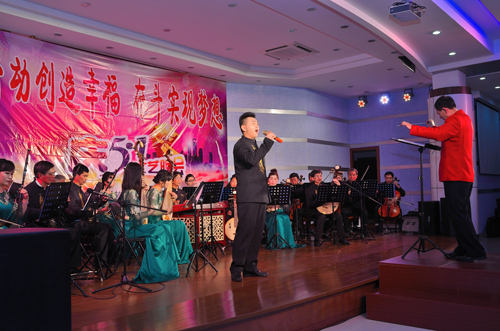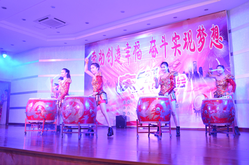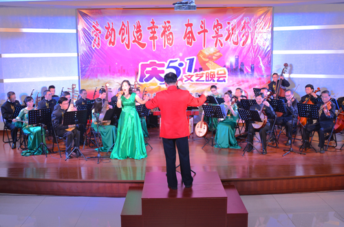 當(dāng)晚,公司俱樂部燈光璀璨,樂聲歡騰。隨著強(qiáng)勁的鼓點(diǎn)響起,開場舞《騰龍鼓樂》拉開了整場晚會的序幕,隨后,公司“老”歌手曾艷輝及團(tuán)委組建的舞蹈隊(duì)帶來了精彩的歌伴舞《雙腳踏上幸福路》,“新”歌手張錚聲情并茂地演繹了歌劇《江姐》選段《我為共產(chǎn)主義把青春貢獻(xiàn)》及民歌《桃花紅杏花白》,龍通藝術(shù)團(tuán)的歌手李紅英、吳罕帶來的獨(dú)唱《好日子》、《我愛你中國》喜慶激昂,羅斌峰的笛子獨(dú)奏《牧民新歌》及樂團(tuán)現(xiàn)場演奏的《龍江歡歌》、《紅樓夢插曲》、《蘇南小調(diào)》余音繞梁,男歌手熊凱、溫?zé)ㄕ竦哪新暘?dú)唱《格桑梅朵》、《懷念戰(zhàn)友》、《駿馬奔馳保邊疆》、中央民族大學(xué)聲樂碩士郭源源為大家?guī)淼摹逗oL(fēng)陣陣》、《一杯美酒》大氣悠揚(yáng)。