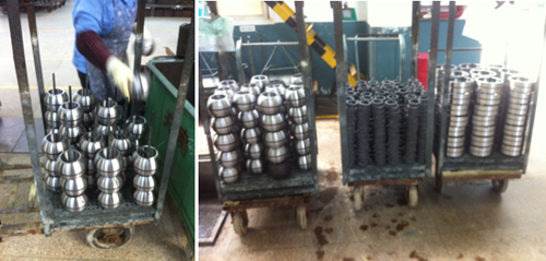 長期以來,公司表面防護車間的工件都是通過人工操作方式將表面處理前、后的套圈串入或卸下料籃上的芯桿(如圖1所示),這種現象存在操作者人數多、體力耗費重、速度慢、效率低的問題。另外,操作者用手接觸套圈工件,不僅工件表面殘留的處理液會造成皮膚腐蝕或過敏,而且操作者手套上殘存的污跡會帶來工件表面的二次污染和腐蝕。