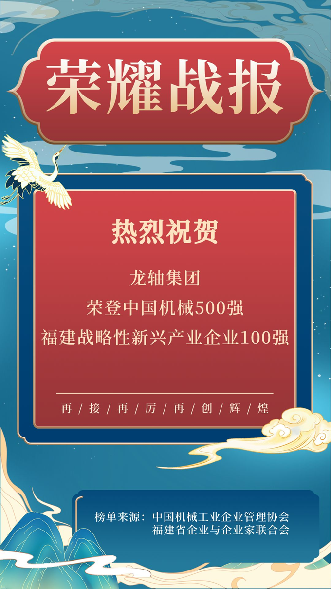 公司以雄厚的規模力、出色的效率力、強大的成長力和豐富的資源力再度獲評中國機械500強、福建戰略性新興產業企業100強,已連續15年上榜中國機械500強,連續3年上榜福建戰略性新興產業企業100強。