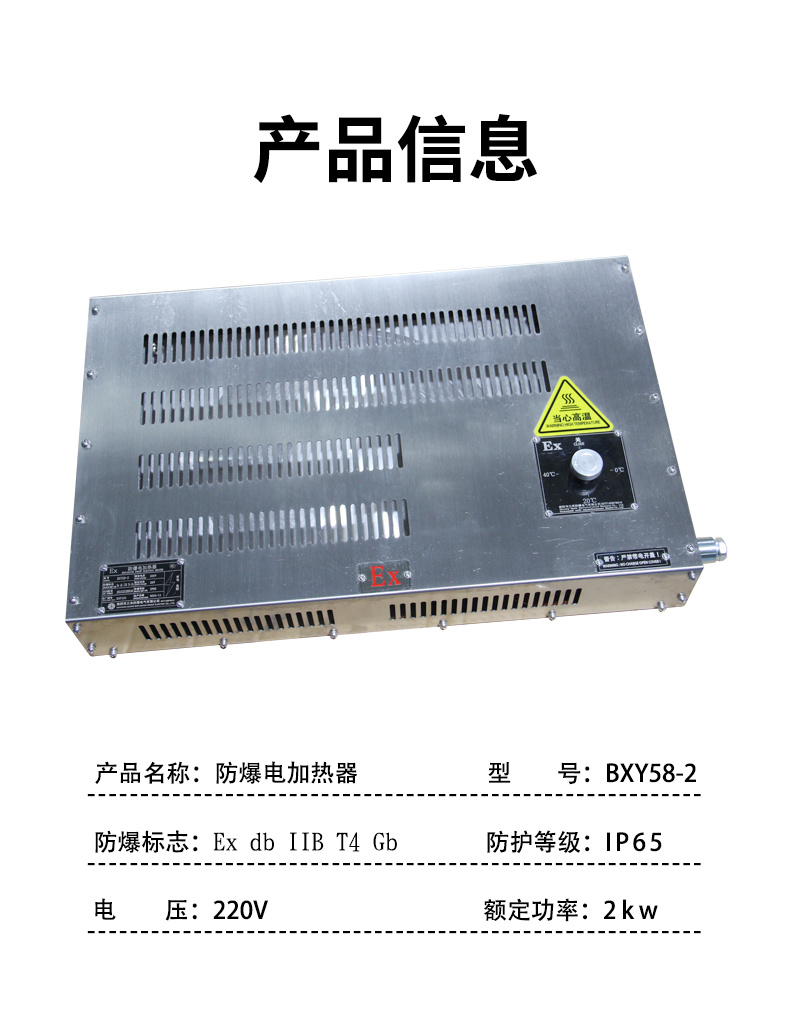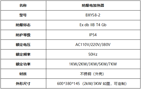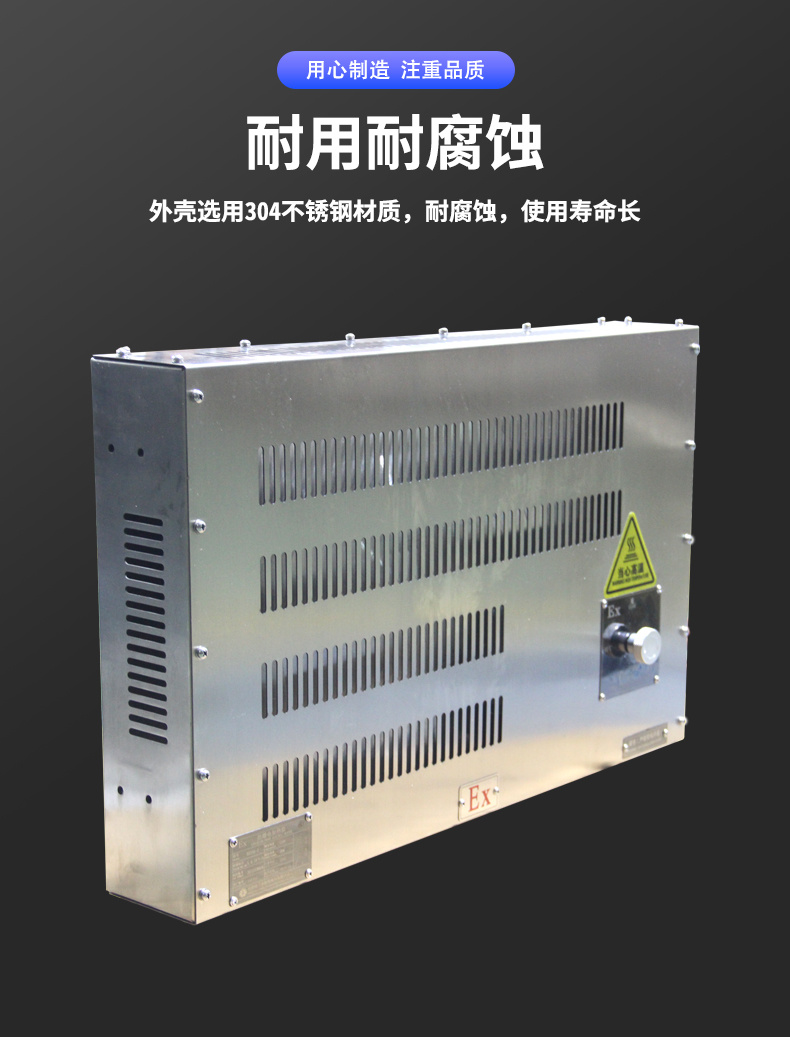 1、本列產品防爆空間加熱器的一種,其腔體內有電加熱板,外殼不銹鋼,通過散熱向空間發熱量,達到取暖效果。